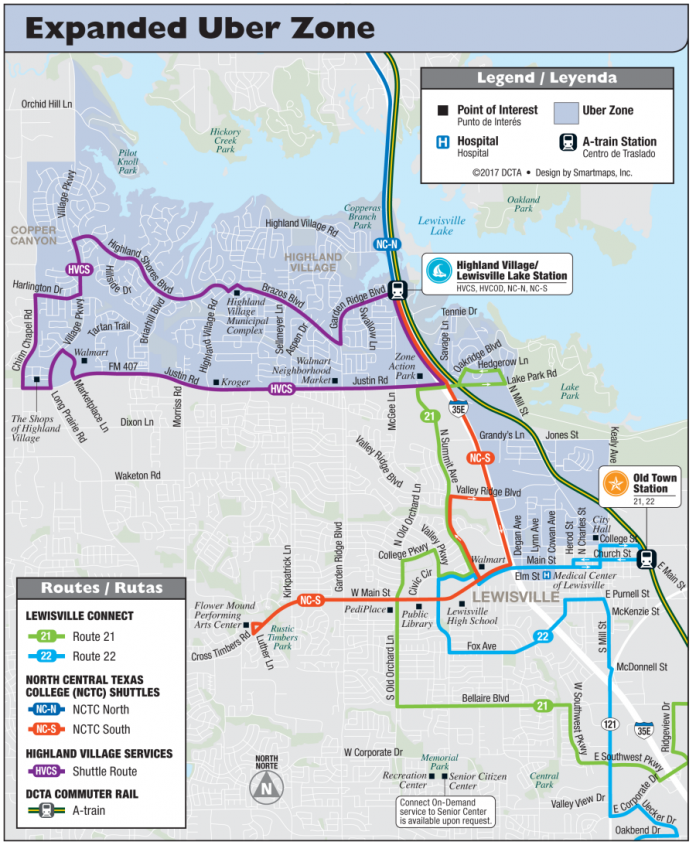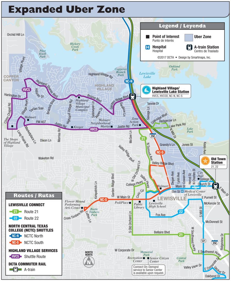 The new Expanded Uber Zone will provide additional mobility options for convenient transfer opportunities to Lewisville Connect Bus routes and the Highland Village/Lewisville Lake A-train station.
