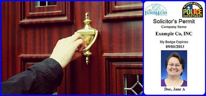 “We’ve been made aware that some citizens are experiencing an increase in door-to-door sales people recently,” the department’s Facebook post says. “If you encounter a solicitor at your door, they must have a Town of Flower Mound Solicitor Permit, like the one pictured.”