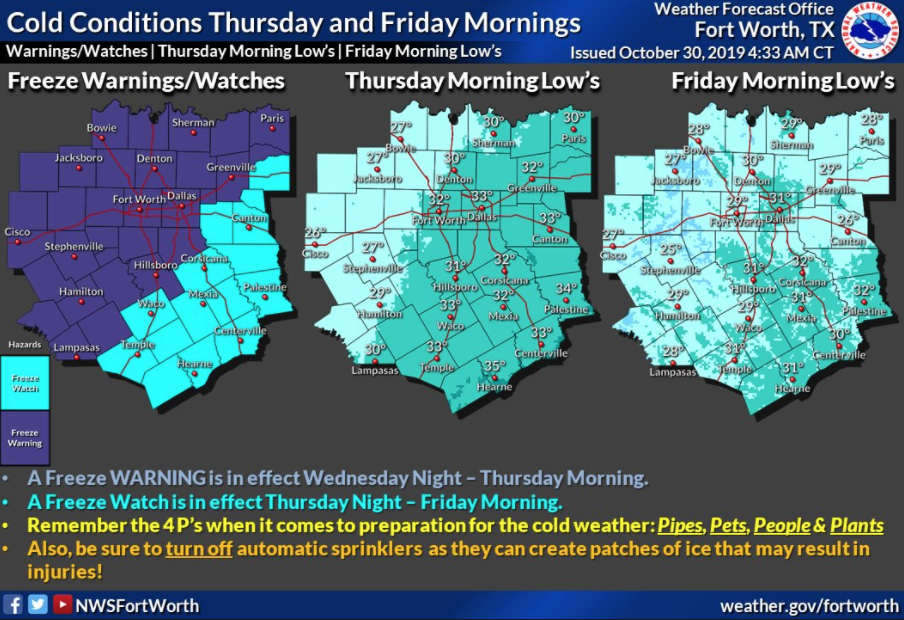 The National Weather Service has issued a Freeze Warning for North Texas from 1-10 a.m. Thursday with temperatures expected to reach between 27-32 degrees overnight as a cold front moves through the area. Frost and freezing temperatures may kill crops and sensitive vegetation, and could damage unprotected outdoor plumbing. Automatic sprinkler systems should be turned off to avoid creating ice patches.
