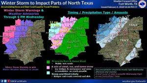 A wintry mix of sleet, ice and snow is expected to move through Denton County on Wednesday morning, according to the National Weather Service.