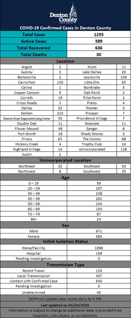 For information regarding DCPH’s upcoming testing centers, visit dentoncounty.gov/COVID19testing. For additional COVID-19 data, including active case information by municipality, hospital capacity and ventilator utilization, visit dentoncounty.gov/COVIDstats. For COVID-19 health and safety information, visit dentoncounty.gov/COVID19.