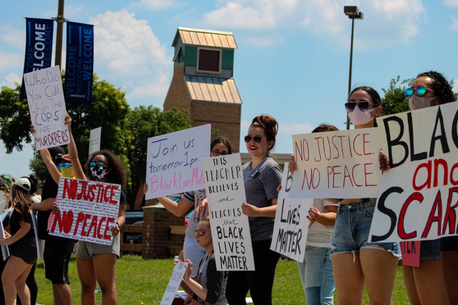 The first day of their protest, Edwards said there were consistently 45 people, from high school and college students to families with their children, lined up along the street with signs and messages in hand. Since then, they’ve had as many as 105 people coming, including surrounding business owners and even the Flower Mound Police Department bringing coolers of water and Gatorade in hand for everyone participating in the protest.