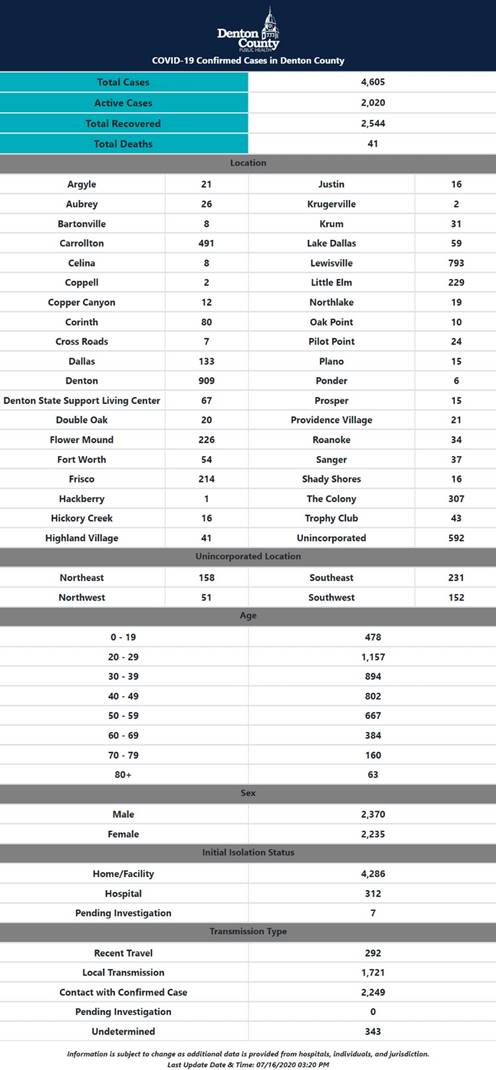 For additional COVID-19 data, including active case information by municipality, hospital capacity and ventilator utilization, visit dentoncounty.gov/COVIDstats. For information regarding DCPH’s upcoming testing centers, visit dentoncounty.gov/COVID19testing. For additional COVID-19 health and safety recommendations, visit dentoncounty.gov/COVID19.