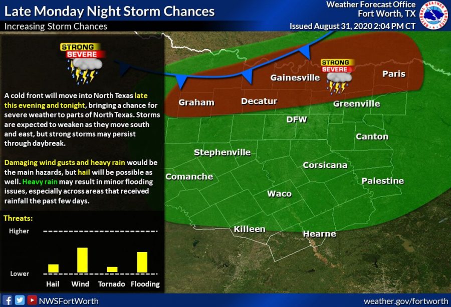 A cold front will move through North Texas late Monday evening, bringing a chance for severe weather for parts of Dallas-Fort Worth, including most of Denton County, according to the National Weather Service. Damaging wind gusts and heavy rain are expected, and hail and flooding are possible. More rain is expected Tuesday, and then another cold front is expected to bring more storms on Wednesday. Thursday will have a 40% chance of rain.