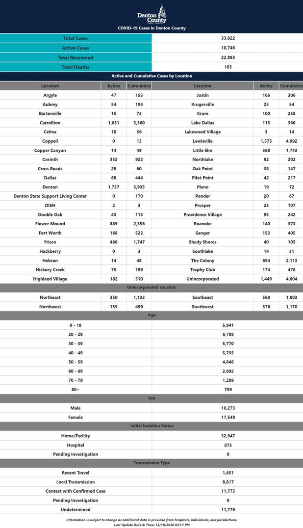 “As cases of COVID-19 continue to rise, we are also reporting the deaths of three individuals due to COVID-19,” said Denton County Judge Andy Eads. “We ask that you bestow prayers upon the families of these individuals. Our hospitals, which are quickly filling, have medical staff in the trenches fighting the battle against this virus. We can help by doing our part to stay healthy and safe by wearing masks, social distancing, and washing and sanitizing hands frequently.”