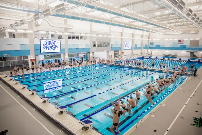 The construction project was completed on time and under budget in 14 months, according to a news release from the district. The grand opening event featured remarks from swim team senior captains as well as an inaugural “first splash” where swimmers from all three of the district’s comprehensive high schools jumped simultaneously from the pool deck into the 50-meter competition pool.
