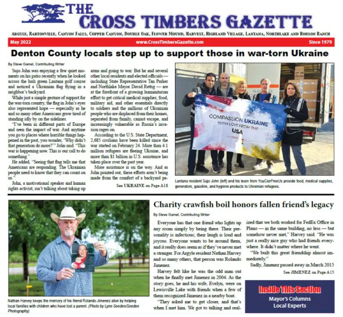 HomeThe Cross Timbers Gazette Latest Issues The Cross Timbers Gazette Latest Issues The Cross Timbers Gazette May 2022 By Max Miller May 1, 2022 0 1966 FacebookTwitterPinterestLinkedinWhatsAppReddItEmailPrint View the Cross Timbers Gazette full-screen. Share FacebookTwitterPinterestLinkedinWhatsAppReddItEmailPrint Previous articleThe Arts: UFOs and the Art FestivalNext articleApril showers made dent in drought conditions Max MillerMax Miller is the publisher of The Cross Timbers Gazette. Related Articles Southern Denton County Local News Marcus High School football players accused of hazing teammate at team dinner in Double Oak Southern Denton County Local News High school football hazing case referred to Grand Jury by Double Oak PD Southern Denton County Life Valley Creek Church to build prayer center at Flower Mound campus Popular This Week Southern Denton County Local News Marcus High School football players accused of hazing teammate at team dinner in Double Oak Southern Denton County Local News High school football hazing case referred to Grand Jury by Double Oak PD Southern Denton County Life Valley Creek Church to build prayer center at Flower Mound campus Southern Denton County Life Argyle teen advances to national top 10 in Broadway singing competition Southern Denton County Schools Lewisville ISD names new principal for elementary school in Flower Mound