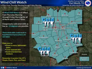 Thursday’s low temperature will fall to around 10, with wind chill values falling below 0. The weather service has issued a Wind Chill Watch for Thursday morning through Friday morning for all of North Texas.