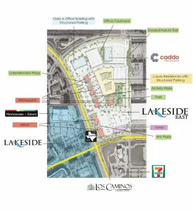 Lakeside currently includes over 40 shops and restaurants, 260 single-family homes, 1,090 multi-family residences, and 165,000 square feet of office space. The proposed extension of Lakeside would bring additional restaurants with patios, shops, services, luxury residences for lease with secured structured parking, multiple open spaces including another music/entertainment plaza, an arts plaza, an activities plaza, public trails, a four-story office building, and a hotel with a high caliber brand, according to Realty Capital.