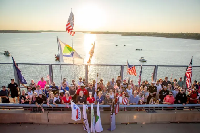 Officials from Lewisville, Highland Village, and Denton County, carrying American flags, will meet city leaders from Hickory Creek, Corinth, Lake Dallas, Shady Shores, and Denton carrying their own flags, at the midway point of the Lewisville Lake pedestrian bridge for a “virtual handoff” at sunset, according to a news release from the city of Lewisville.
