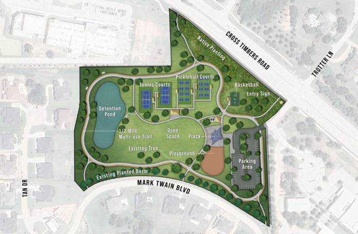 In July 2024, the Flower Mound Town Council approved the Trotter Park master plan, which calls for two tennis courts, 12 pickleball courts, one basketball court, a playground, half-mile multi-use trail, and more.