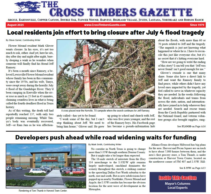 HomeThe Cross Timbers Gazette Latest Issues The Cross Timbers Gazette Latest Issues The Cross Timbers Gazette August 2025 By Max Miller August 1, 2025 0 690 FacebookTwitterPinterestLinkedinWhatsAppReddItEmailPrint View the Cross Timbers Gazette full-screen. Share FacebookTwitterPinterestLinkedinWhatsAppReddItEmailPrint Previous articleFirefighters contain grass fire near Canyon Falls in Flower MoundNext articleBarton: Rain was hard to come by as July heated up Max MillerMax Miller is the publisher of The Cross Timbers Gazette. Related Articles Southern Denton County Local News High school football hazing case referred to Grand Jury by Double Oak PD Southern Denton County Local News Marcus High School football players accused of hazing teammate at team dinner in Double Oak Southern Denton County Life Valley Creek Church to build prayer center at Flower Mound campus Popular This Week Southern Denton County Local News High school football hazing case referred to Grand Jury by Double Oak PD Southern Denton County Local News Marcus High School football players accused of hazing teammate at team dinner in Double Oak Southern Denton County Life Valley Creek Church to build prayer center at Flower Mound campus Southern Denton County Life Argyle teen advances to national top 10 in Broadway singing competition Southern Denton County Schools Lewisville ISD names new principal for elementary school in Flower Mound