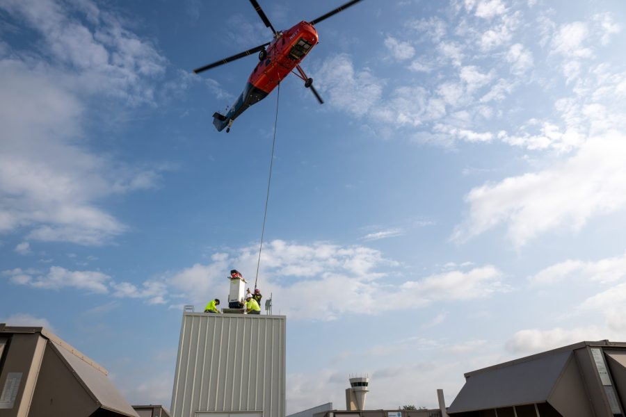 A TruWeather Solutions weather sensor being installed via helicopter in AllianceTexas. (Photo courtesy of Hillwood)