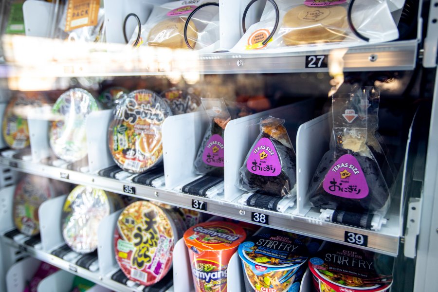 The café is lined with self-service vending machines, stocked with snacks and drinks from Marty B’s, Emporium Pies, Purpose Macarons and Edison Coffee. The machines also dispense fresh sushi, ramen, stuffed pancakes and mystery packages called Blind Boxes.