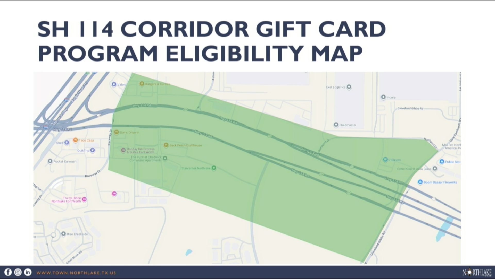 The gift cards will be good for businesses that generate sales tax and have primary access and frontage on 114.