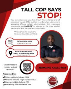 A joint event between the Marcus and Flower Mound high school PTSAs on Tuesday will feature “Tall Cop” Jermaine Galloway, who educates on the most up-to-date trends in drug use.