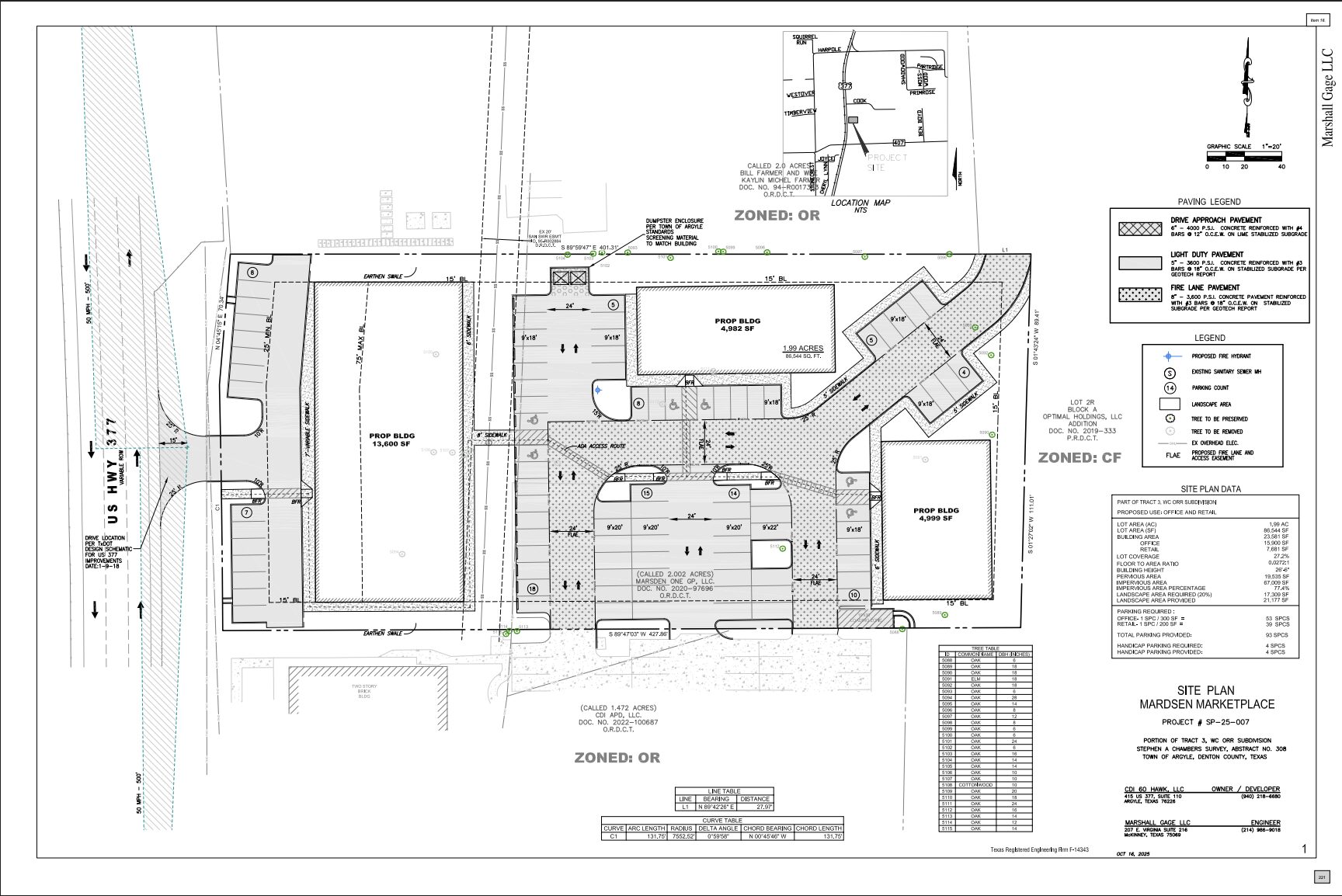 Colo Development Partner’s three-building, 23,000-square-foot development, called Argyle Market Place, will be located just south of Little Joe’s Farmstead restaurant along Hwy 377 just south of Cook Street.