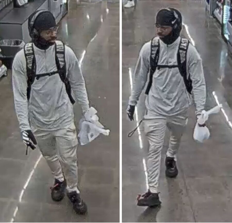Officials said the suspect was wearing a light grey hoodie, light grey sweatpants, a balaclava-style mask, a backpack and headphones.