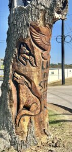 An Argyle tree that once stood tall at the corner of Hickory Hill Road and Hilltop Road was damaged by a storm in 2024, but the property owners had it converted into a work of art.