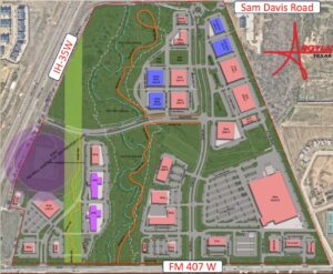 Plans also include setbacks along FM 407 and areas near new schools east of the site, as well as lower-density development along the northern edge near Sam Davis Road. Proposed roundabouts at Sam Davis Road and Gateway Drive are intended to discourage cut-through traffic.