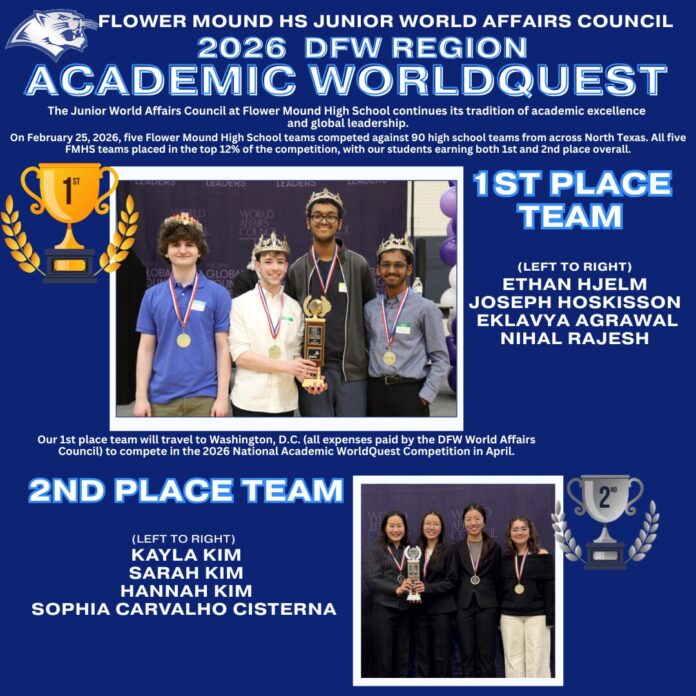 Four students from Flower Mound High School have earned a trip to Washington D.C. to compete at Academic WorldQuest Nationals after winning the regional competition on Wednesday.