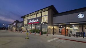 The new Tom Thumb includes a bakery, deli, meat and seafood, produce and floral departments, as well as an in-store Starbucks kiosk, pharmacy with a drive-thru lane, and Drive-Up-N-Go grocery pickup service.