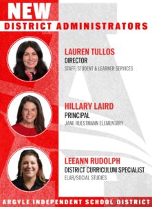 Lauren Tullos, the current principal of Jane Ruestmann Elementary, will become Argyle ISD’s director of staff, student and learner services.